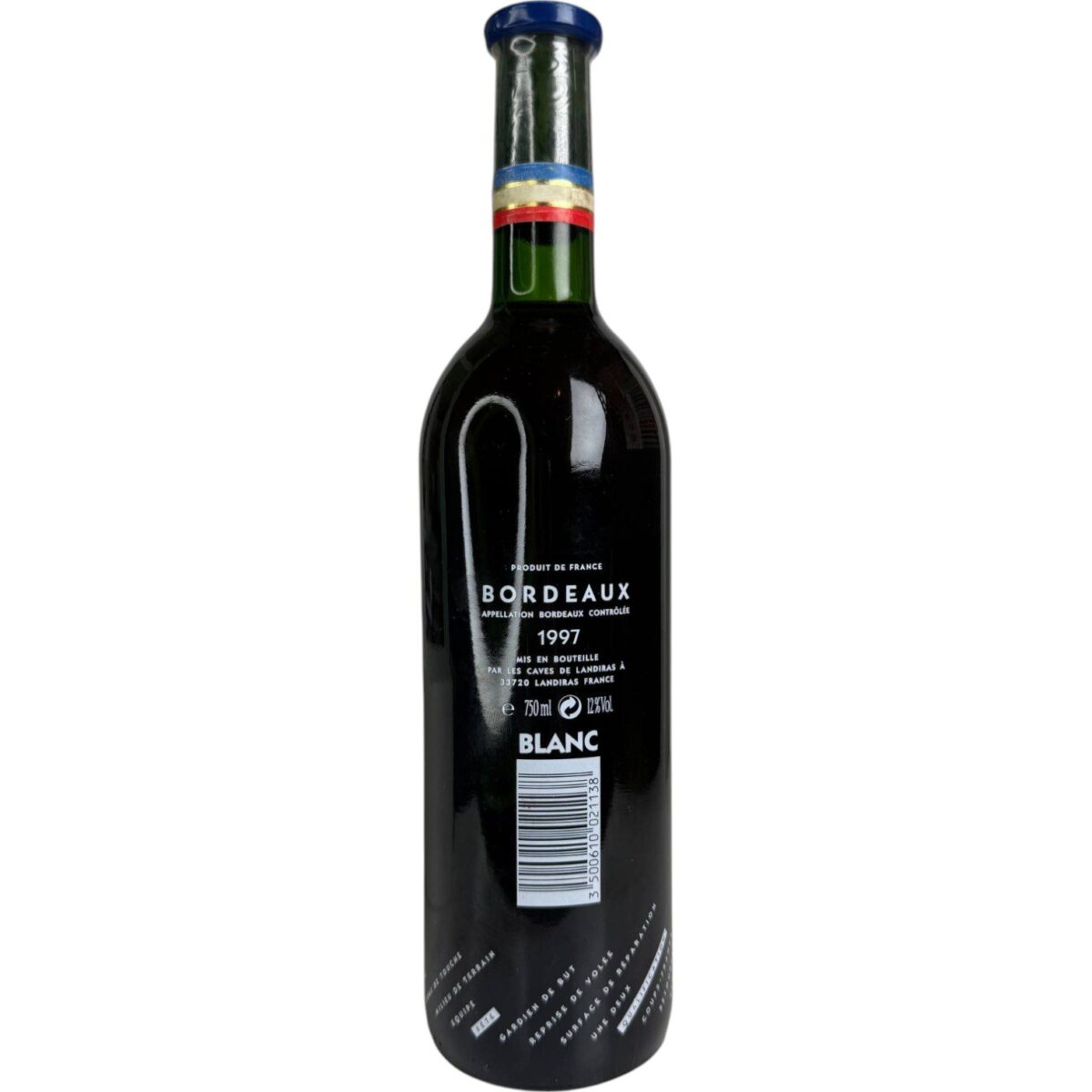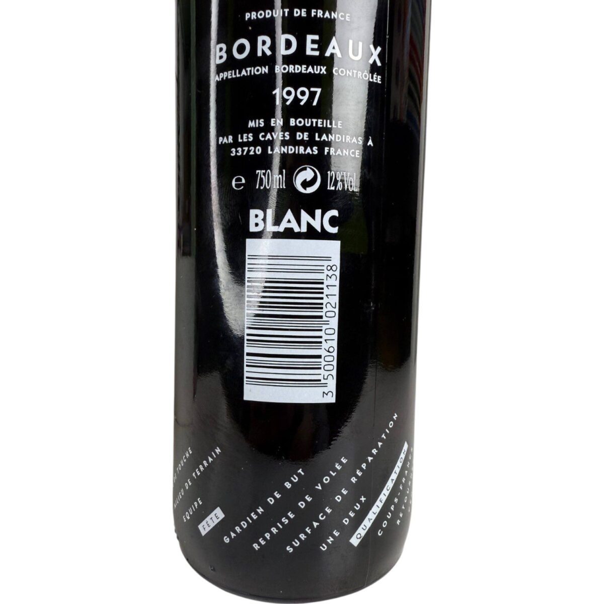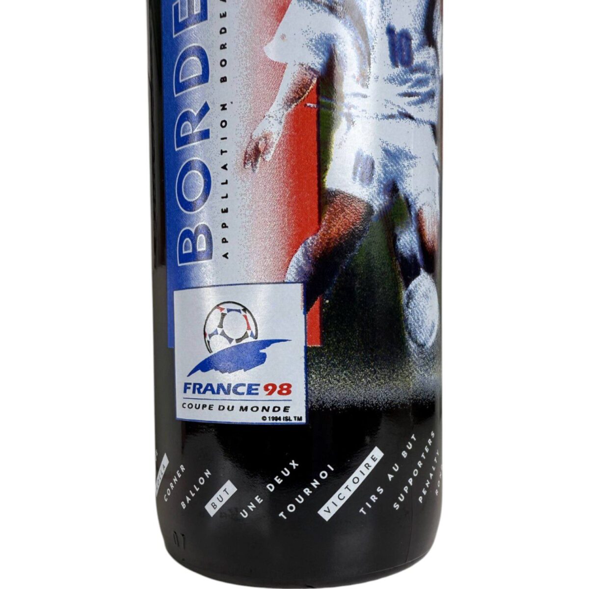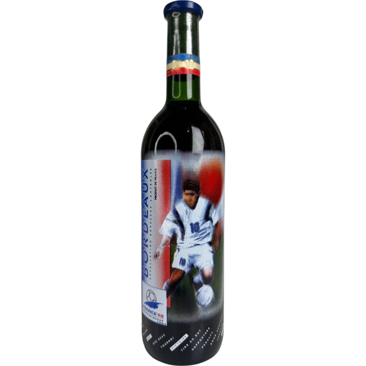 • Botella original de vino Bordeaux, lanzada como edición especial conmemorativa del Mundial de Fútbol Francia 1998.