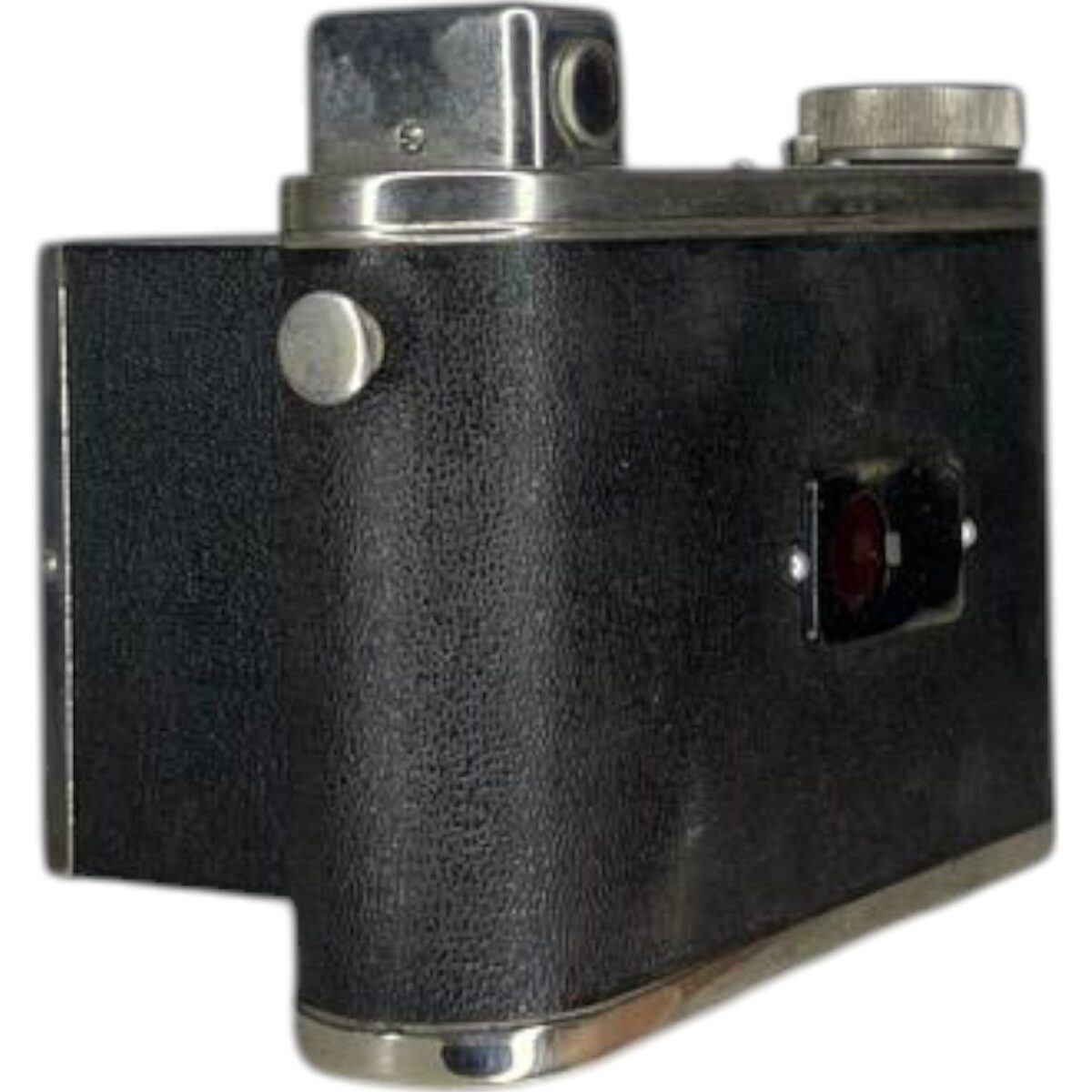 Cuenta con velocidades de obturación de 25, T y 50, y un rango de apertura de f/7.7 a f/16, lo que la convierte en un modelo versátil para su época. El diseño frontal cuadrado con detalles metálicos y acabados en cuero sintético negro le da un look sobrio y elegante, perfecto tanto para exhibición como para un toque decorativo vintage.
