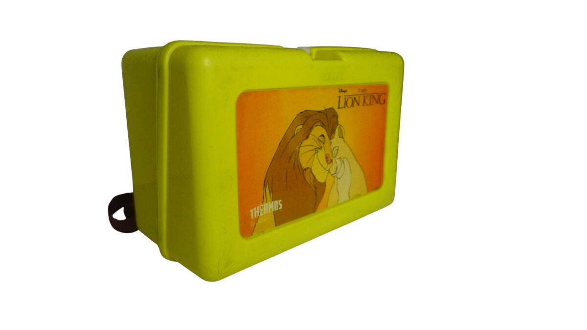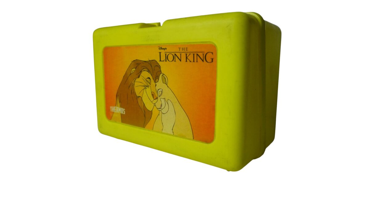 Lonchera infantil con adhesivo/serigrafía de The Lion King (Simba / Nala estilo clásico). Caja de plástico rígido de color amarillo-verdoso con borde biselado y cierre superior de plástico, El diseño es sencillo, tipo set promocional/merchandising (posible producto licenciado por Thermos/Disney para escuelas/colección).