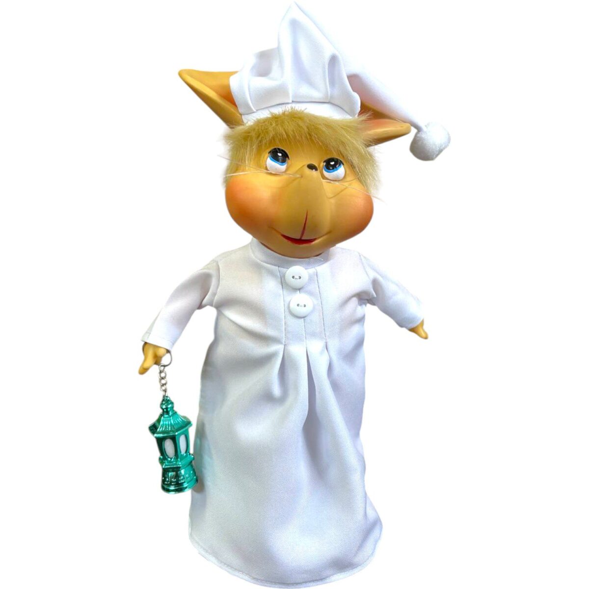– Ropa pijama de tela blanco, botón al medio, gorro con bolita en punta