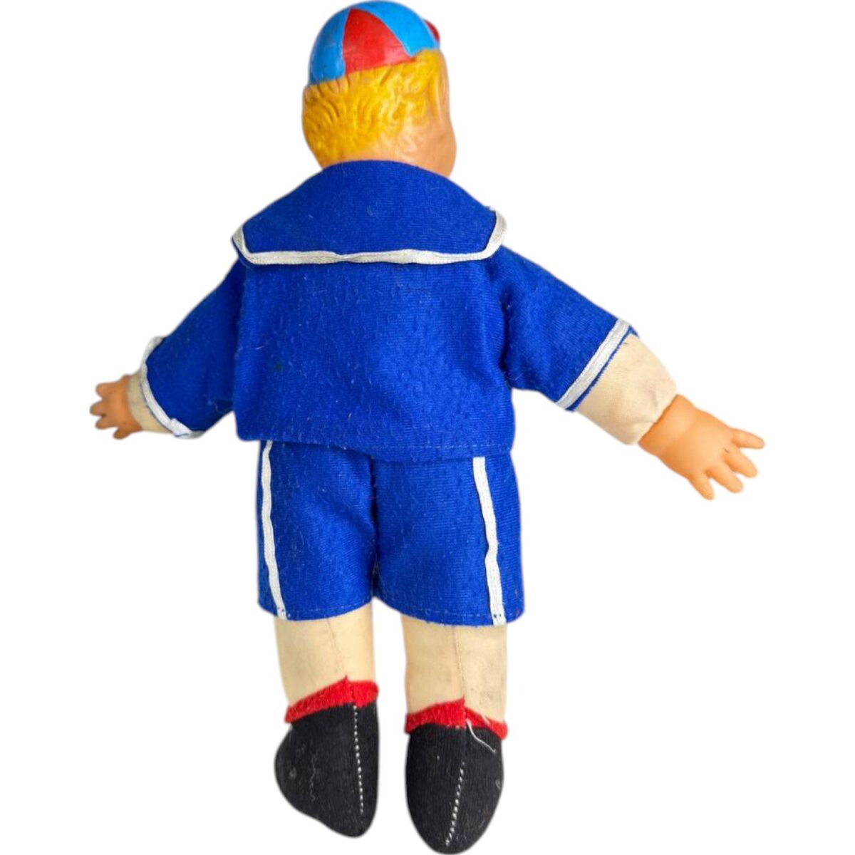 • Con cabeza y brazos de jebe (goma blanda) y cuerpo de tela relleno, típico del estilo de juguetes de esa época.