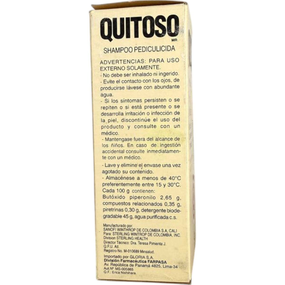 • Producto original de la marca Quitoso, reconocido shampoo pediculicida de uso común en los años 80 y 90.